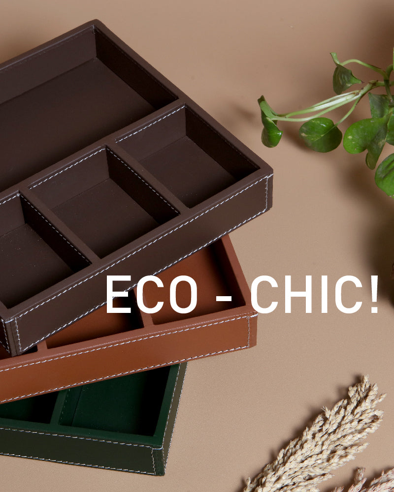 Transform your home with our collection of eco-conscious accessories, crafted from biodegradable leather. From sleek waste paper bins to beautifully framed mirrors and versatile multi-utility storage boxes, each piece is designed to blend functionality with sustainable style.